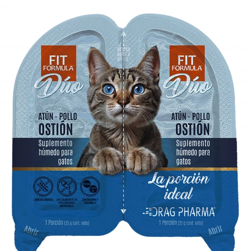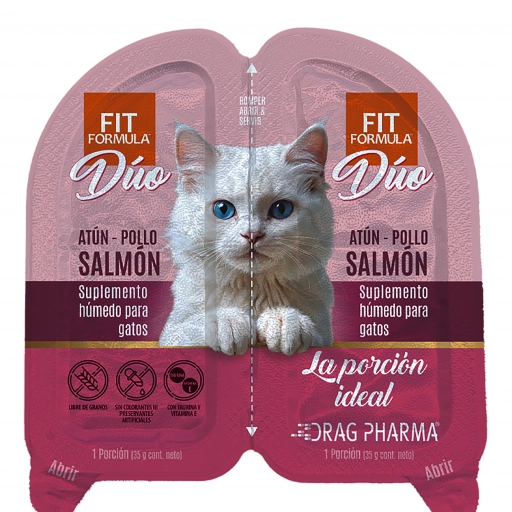 Dúo combina proteínas de origen marino y terrestre, con dos variedades: pollo con atún y salmón, y pollo con atún y ostión. "Es un plato de mar y tierra para gatos. Esta mezcla crea un sabor irresistible y libera aromas intensos que estimulan el instinto depredador del gato y provoca que incluso los más exigentes coman", explica Herly Studer, médico veterinario de Fit Formula.